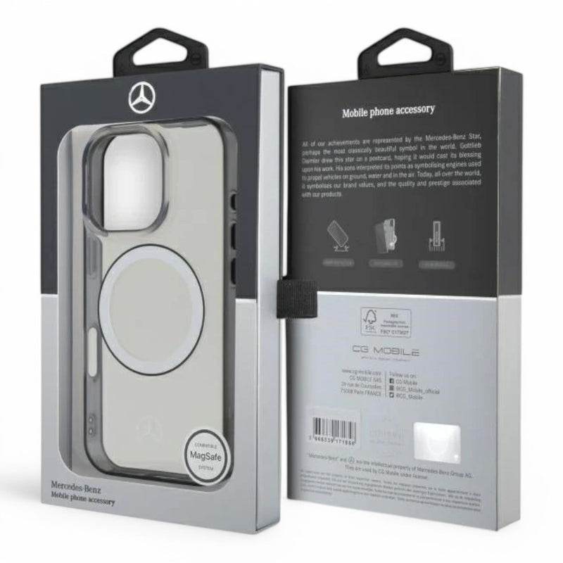 Presentamos la Funda MagSafe Transparente Mercedes Benz para iPhone 16 con aro negro, una funda que eleva la protección de tu teléfono sin ocultar su diseño premium.